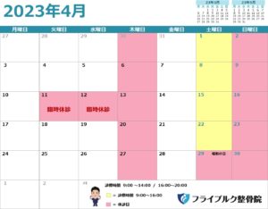 4月 臨時休診のお知らせ 2023.04.03 お知らせ いつもお世話になっております。 4月11日(火)12日(水)の2日間 セミナー参加のため、臨時休診させて頂きます。 ご迷惑をおかけしますがよろしくお願いします。 フライブルク整骨院